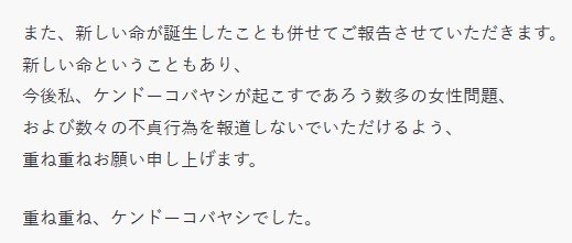 「新しい命ということもあり、今後私、ケンドーコバヤシが起こすであろう数多の女性問題、および数々の不貞行為を報道しないでいただけるよう、重ね重ねお願い申し上げます。」と、念押し!