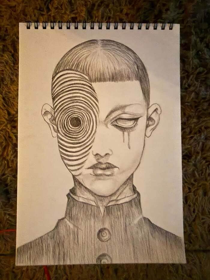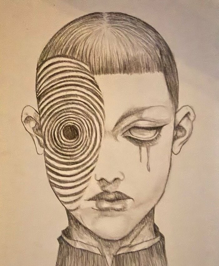 顔の片側は真っ黒な目を中心に渦を巻き、もう片側はりりしい眉毛に、透き通るような瞳から涙のようなものが流れています。