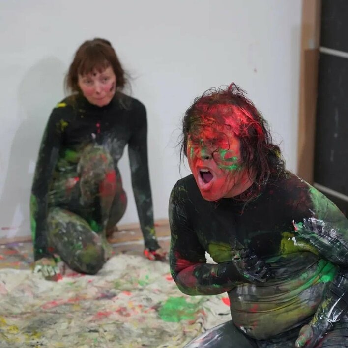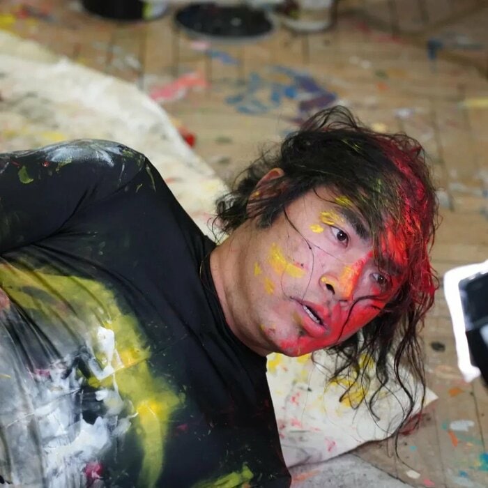 さらに体にも緑や白などの色が塗られており、背景の白壁や絵の具が飛び散ったようなカラフルな床も相まって、中岡さん自身がアート作品に仕上がっていますね。