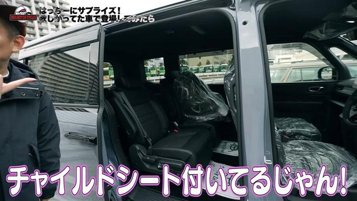 早速、スライドドアを開けてみると蜂谷さんは「チャイルドシート付いてるじゃん!」と、またもやサプライズにびっくり!