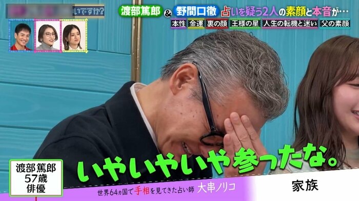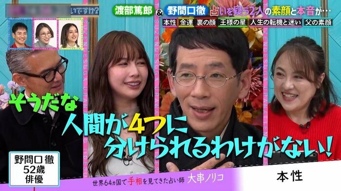 大串さんの忖度なしの占いは続き、「心配性」「プライドが高くて人を見下すところがある」と、野間口さんを次々と鑑定。野間口さんは「そういうことを言うんじゃないですよ!」と笑いながらも、「ぼーっとしてるのに『冷たそう』とか言われる」と、周囲が抱く印象を語りました。
