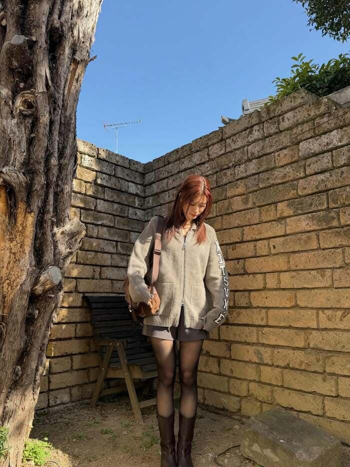 全身を写したショットでは、ショートパンツに透け感のあるタイツとブラウンのブーツを合わせたスタイルで、スラッとした生見さんの美脚が際立っています。