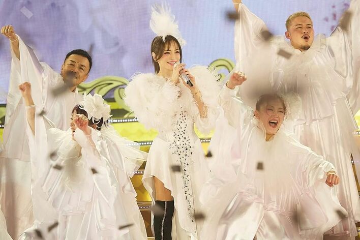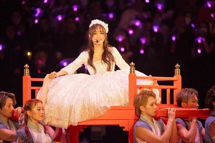 おみこしに担がれながら、デコルテ部分が大きく開いた白の衣装の浜崎さんも。キラキラと輝くドレスが目を引きます。