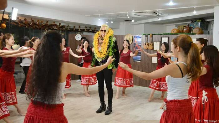 その後、訪れたのは3歳から80歳までの生徒がいるという大人気のフラダンス教室。この日は主婦の生徒が多いとのことで、ローランドが登場すると、歓声があがった。