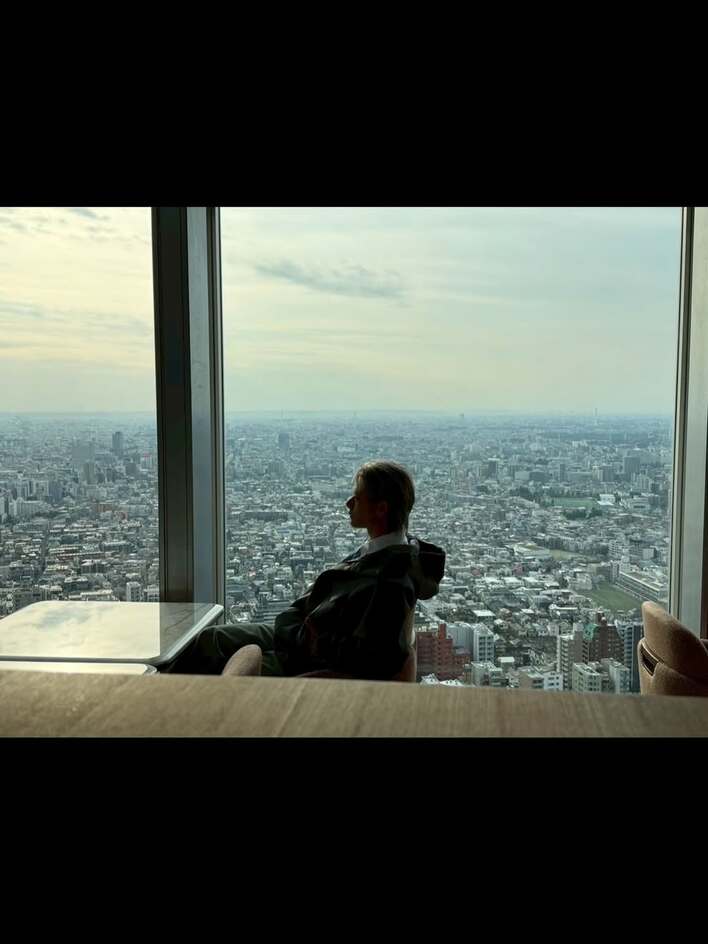 続いて、都会の街並みが一望できる高層階の部屋の窓際で、ソファに深々と腰をかけているショット。部屋は少し薄暗く、横を向いてすっと前を見つめる平野さんの姿からは、静寂に包まれた空気感が伝わってくるようです。