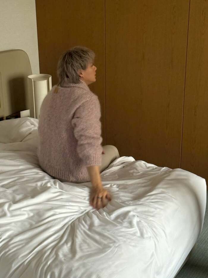 そして、広々とした白いベッドに腰を掛け、リラックスしている姿も。まくった袖からは男らしいがっしりとした腕がちらり!