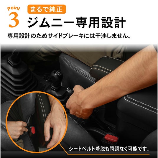 3.ジムニー専用設計専用設計のためサイドブレーキには干渉しません。シートベルト着脱も問題なく可能です。