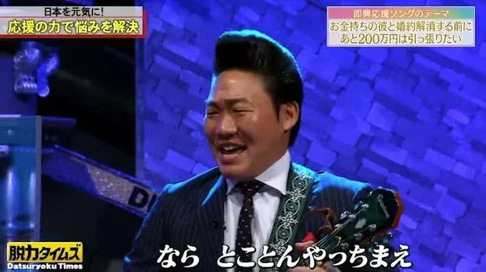 それでもキャスターアリタに促され、半ば強引に「人生終わっても、死ぬまで賭けろ~♪」「なら とことんやっちまえ いっちまえ♪」と、相談者の背中を押す即興ソングを歌いあげました。