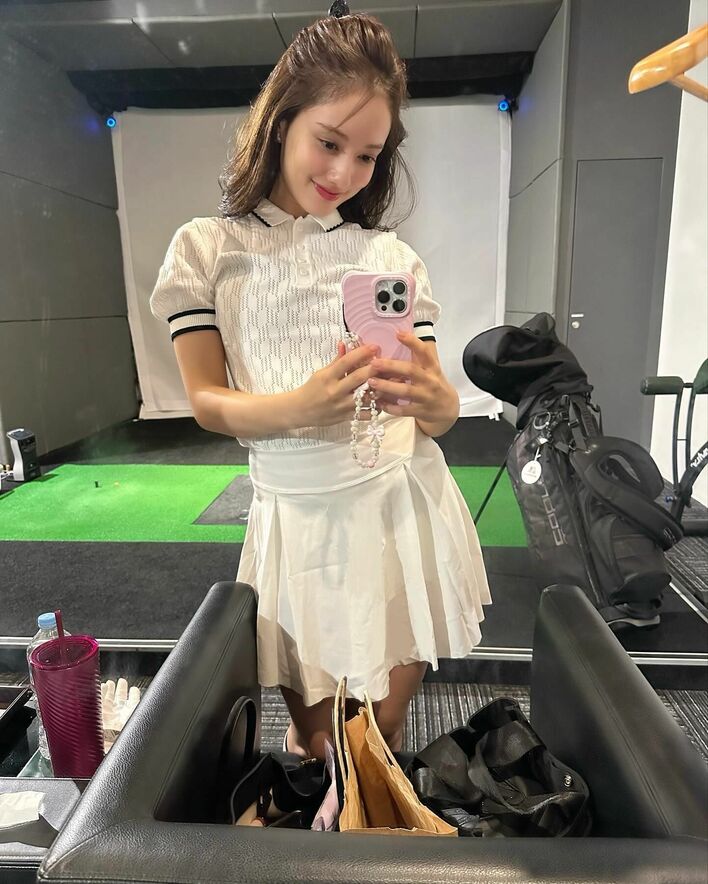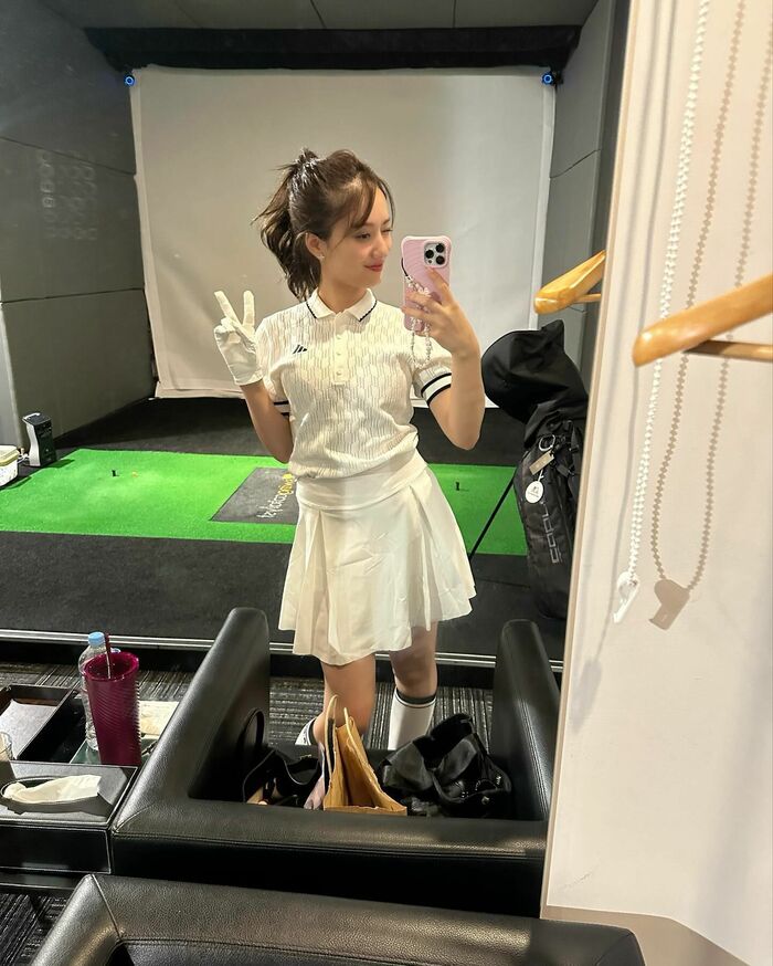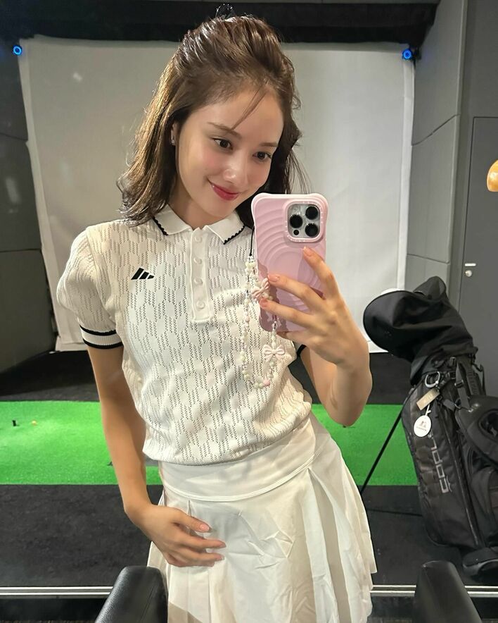 公開された写真には、ハーフアップのヘアスタイルに全身白のゴルフウェアを着た谷さんの姿が!