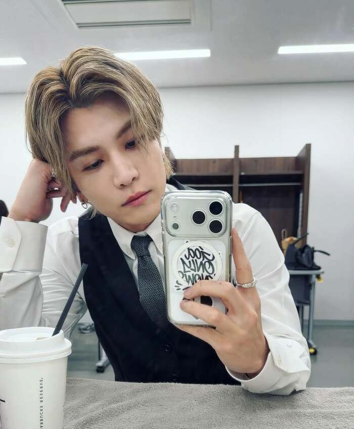 さらには、アウターを脱ぎ、ベストスーツ姿で自撮りをパシャリ!岩田さんは、テーブルに片肘をつき、軽く頭を支えるように顔を傾けていて、ほんのりと憂いを帯びた目元と柔らかく力の抜けた口元が、大人の余裕と色気をにじませています。