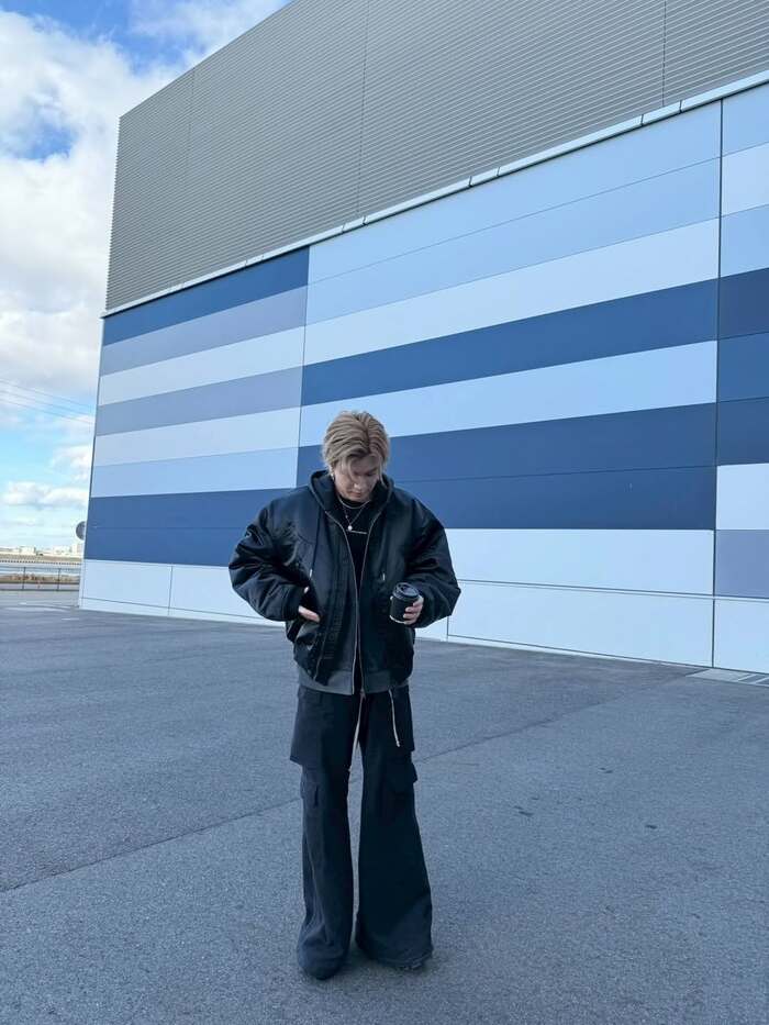 まずは、グレーのパーカーに黒いジャケットを羽織り、裾が広がった黒いパンツを合わせたモノトーンコーデの私服ショット。岩田さんは青々とした空の下、ドリンクのカップを片手に、うつむき加減ですらりとたたずんでいます。