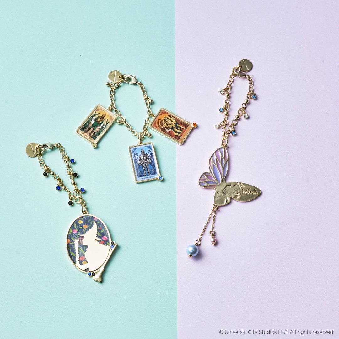グリンダをイメージしたカラーの蝶モチーフ、ショルダーバッグの裏地と同様の総柄にエルファバのシルエットをデザインしたチャーム、物語に登場するキャラクターをデザインしたチャームの3種がラインナップ。同シリーズのバッグとあわせて、コーディネートをお楽しみください。