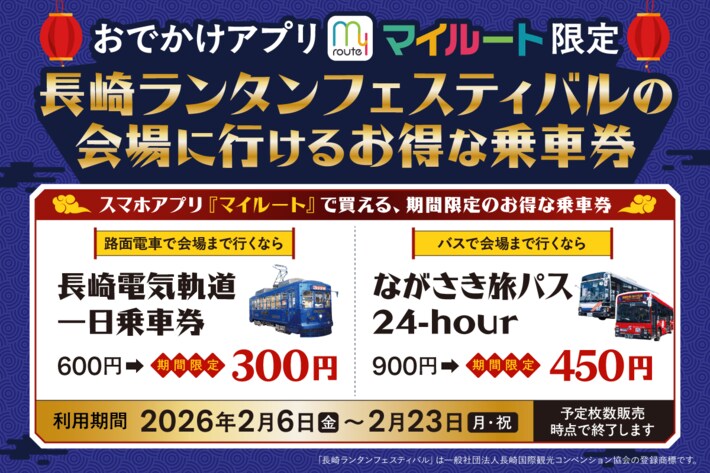 長崎ランタンフェスティバルの開催にあわせて、長崎市内の移動がお得になるデジタル乗車券割引キャンペーンがスタート!。スマートフォンアプリ「my route(マイルート)」限定の特別企画です。