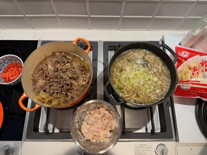 公開された写真では、ガスコンロの上で二つの鍋が同時に煮込まれている様子が写っています。オレンジ色の取っ手がついた大鍋では、よく煮込まれた牛肉と玉ねぎが。