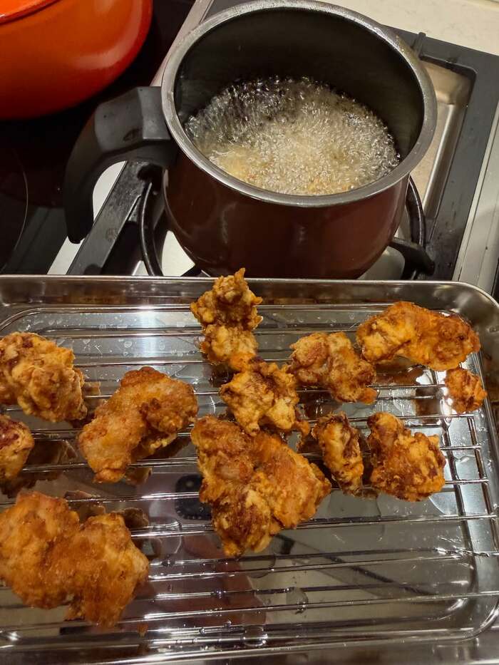 油鍋の中で泡を立てながら揚がっていく様子と、黄金色の鶏の唐揚げが網の上で並ぶ光景が収められています。カリッとした衣の質感が伝わってきて、思わずお腹が空いてしまいそうです。