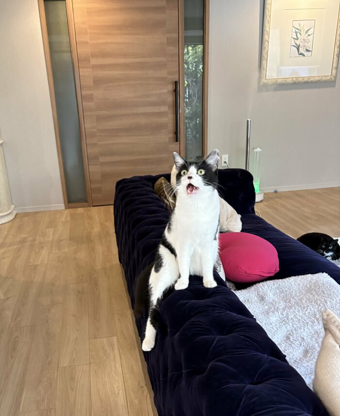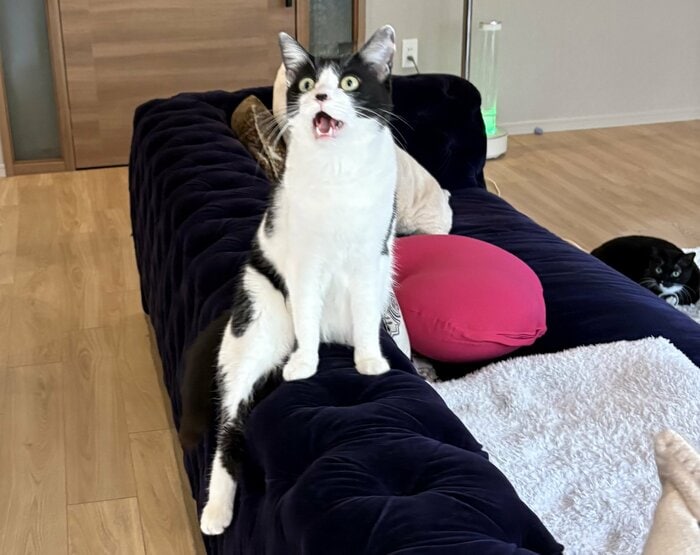 丁寧に両前足をソファにつけて、口を大きく開けながらどこかを見つめるオレオちゃんは、確かに何かを訴えているような表情で、まるで人間のような姿に思わずクスッと笑ってしまいますね。