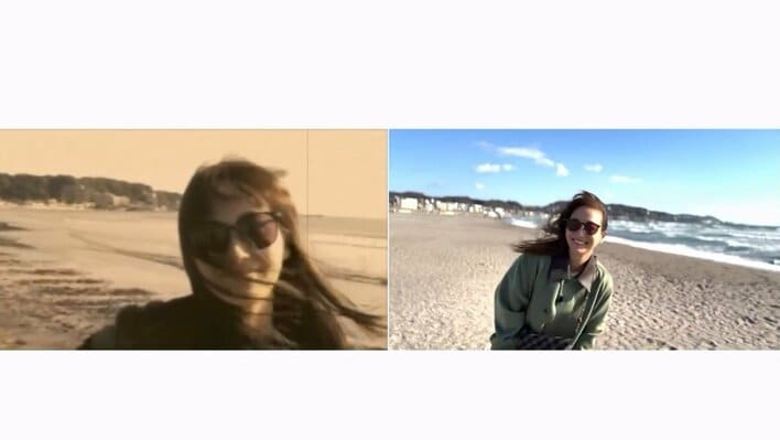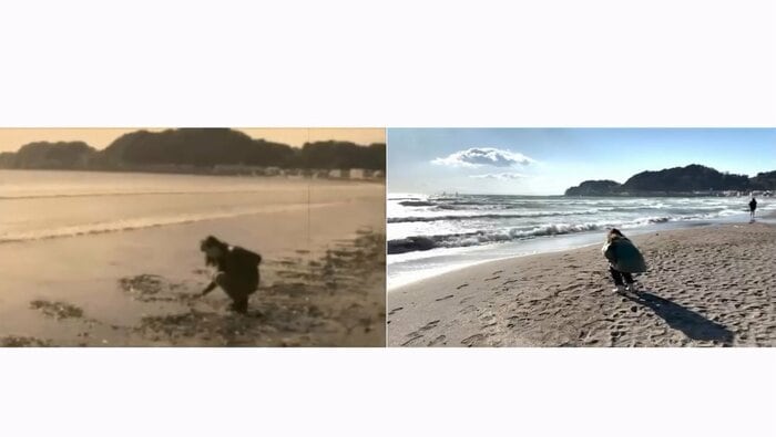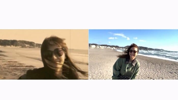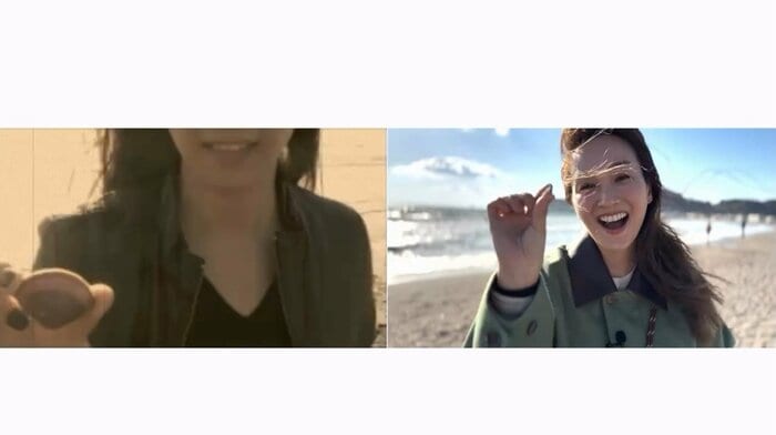 音楽に合わせて画面が切り替わると、そこには、海辺を笑顔で歩く藤本さんの姿が。左右どちらも海を背に同じアングルから撮影されていて、2010年の映像の中の藤本さんは、ジャケットを羽織り黒いサングラスをかけていて、2025年の藤本さんはその姿にならうように、カーキのアウターとサングラスをかけたスタイルをしています。海風に髪をなびかせる様子や何気ないしぐさ、柔らかくほほ笑む笑顔など、15年前と何一つ変わっていません。