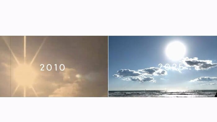 画面を左右に2分割した動画は、左に2010年、右に2025年と、それぞれ当時の空を映し出した映像からスタート。