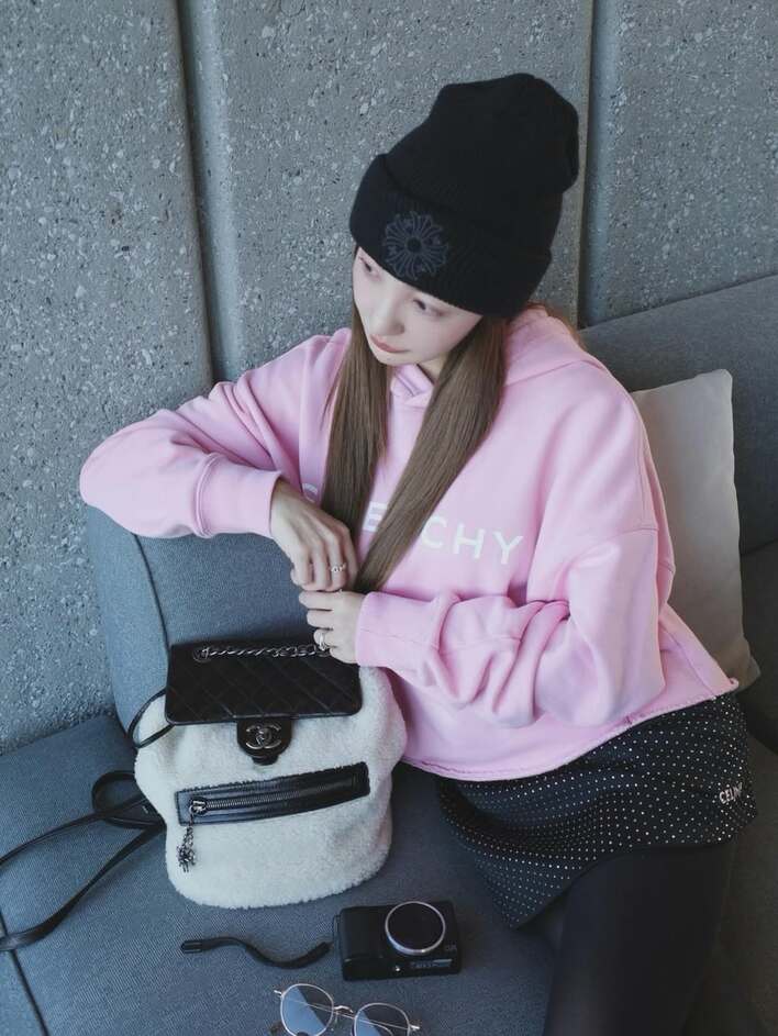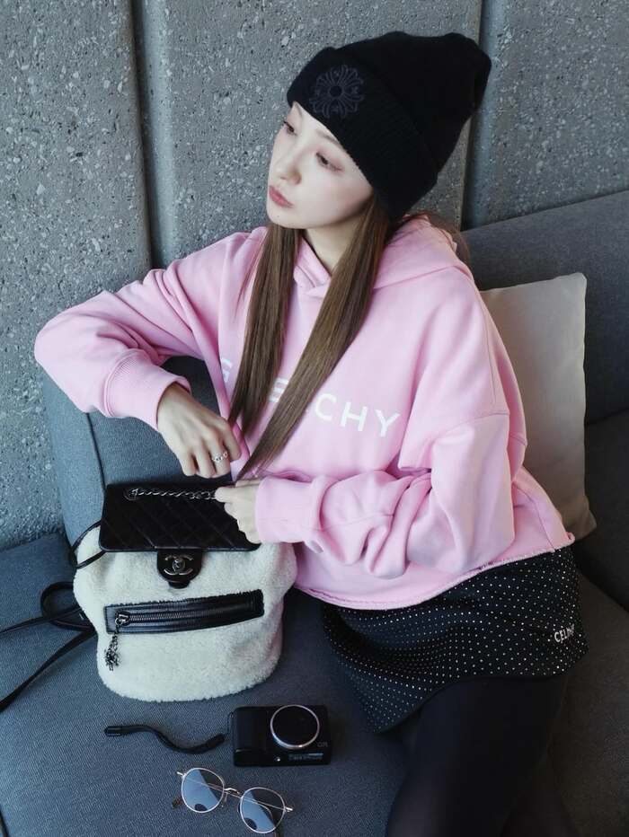 公開された写真では、鮮やかなピンク色のパーカーに黒のビーニー、そして黒地に白のドット柄が入ったスカートを合わせたコーディネートを披露。コンクリートの壁を背景に、白いクッションが置かれたソファに座り、横を向いた穏やかで思案げな表情を見せています。