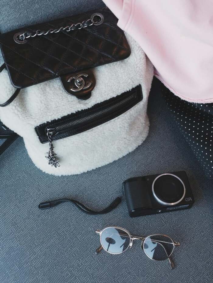そして、コーディネートで使われたアイテムを並べた写真も投稿。白いボア生地のシャネルのバッグは黒いキルティングのフラップとチェーンストラップがアクセントになっており、その隣には黒いコンパクトカメラと丸いフレームのサングラスが置かれ、おしゃれな雰囲気が伝わってきます。