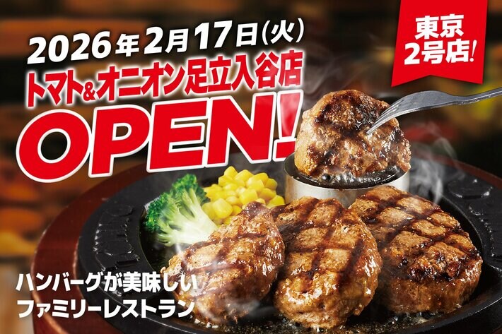 株式会社トマトアンドアソシエイツ(本社:兵庫県西宮市、代表取締役社長:笹村 啓介)が運営する、アメリカンダイニングレストラン「トマト&オニオン」は、2026年2月17日(火)に東京に二店舗目となる「トマト&オニオン 足立入谷店」をオープンいたします。