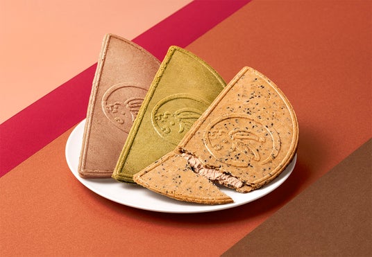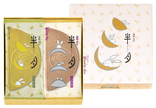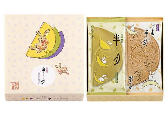 鎌倉五郎本店を代表する、大人気の鎌倉銘菓といえばコレ!月うさぎを描いた大きな半月のおせんべいに、ふわっと軽いクリームがたっぷりはさまれた『鎌倉半月』です。カリッと「おいしい音」がする、ほかにない香ばしい食感は、お子様からご年配まで圧倒的支持をうけています。定番の小倉風味と抹茶風味をご堪能ください。
