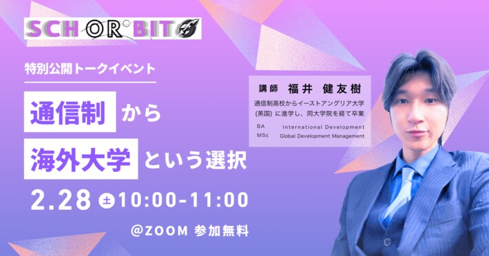 イベント名: Schorbit 特別公開トークイベント|「海外大進学は通信制高校が有利」って本当? 経験者が語る実体験日時: 2026年2月28日(土) 10:00 ~ 11:00(09:30 入室開始)