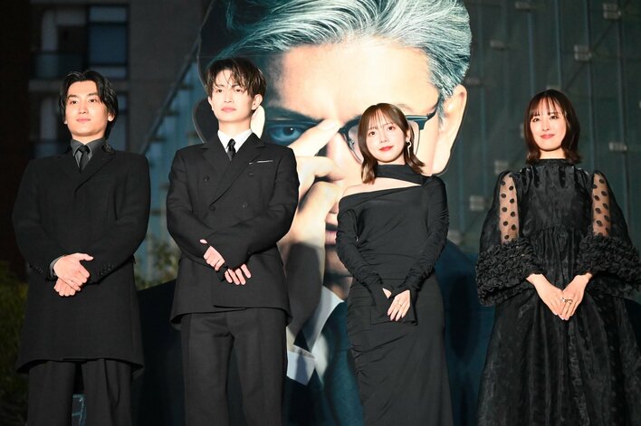 まずは金子大地さん、綱啓永さん、齊藤京子さん、大友花恋さん。揃いのブラックコーデでゆっくりと階段を降りて、報道陣のカメラに笑みを向けました。