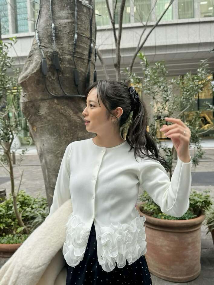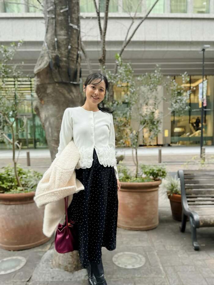 そんな久慈さんは、今回の投稿で「丸の内をお散歩。」「最近はワンピースが楽でワンピースばかり。」とつづり、ドット柄のワンピースに裾にフリルがあしらわれたカーディガンを羽織り、街をお散歩する様子を公開。