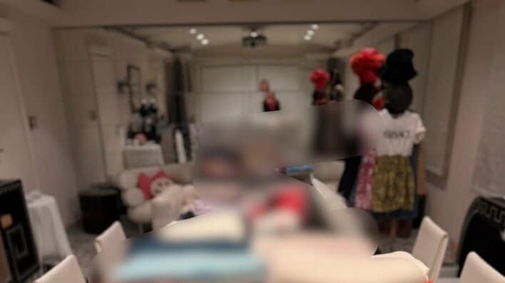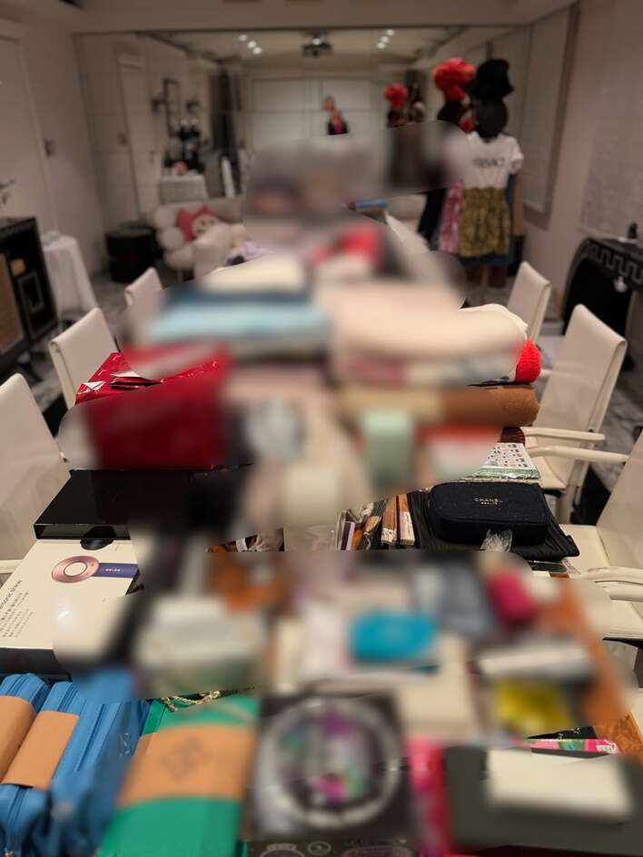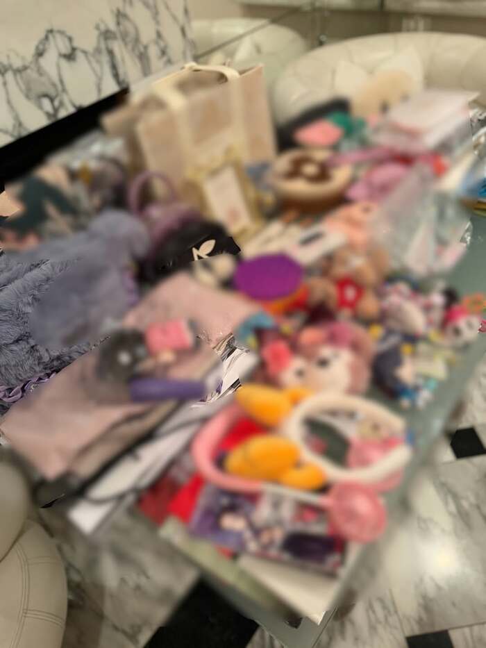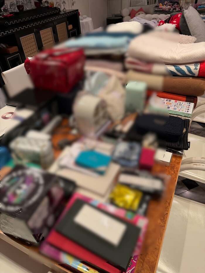 写真には、縦に長いテーブルに置かれたDysonのヘアドライヤーの箱や、CHANELとかかれた黒いポーチなど様々なものが確認できます。その量は多すぎて8人掛けと思われる大テーブルが見えなくなってしまうほど。
