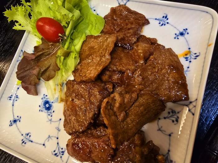 こんがり焼かれた焼き肉に、ミニトマトや葉物野菜を添えています。