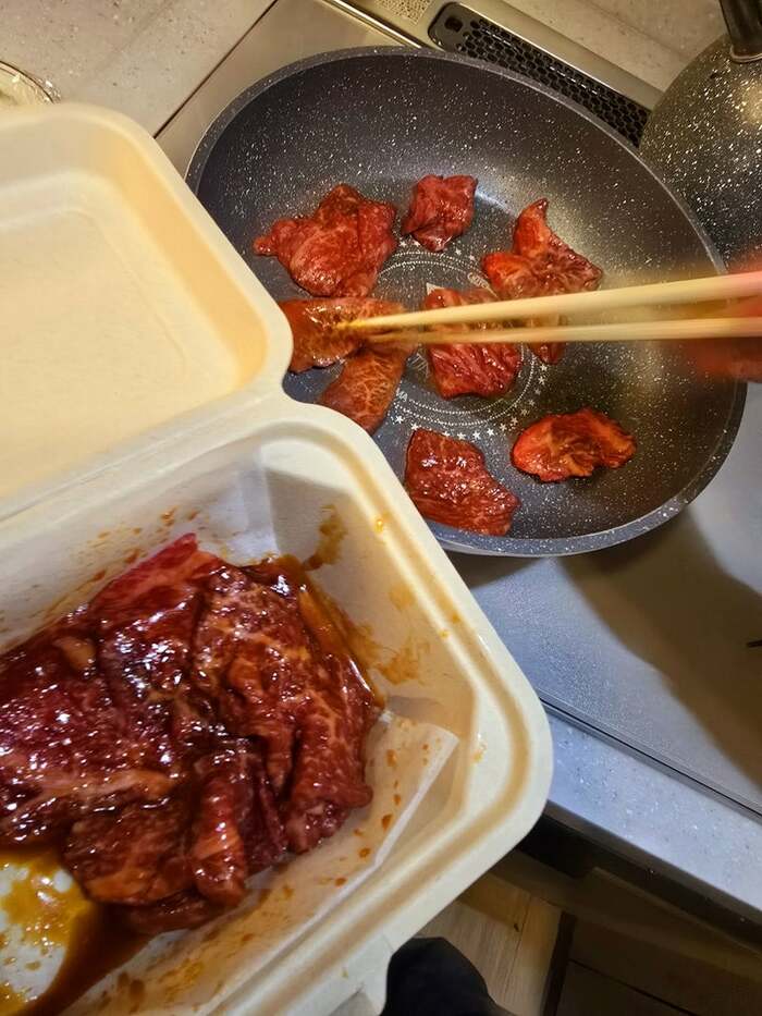 ところが、食欲はここで止まらなかったようで、「どんどんお腹が空いてきて 焼肉も始めました(笑)」とつづり、タレが絡んだ赤身の肉をフライパンで焼き始めた様子も公開。