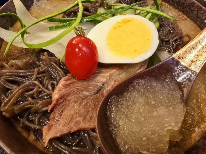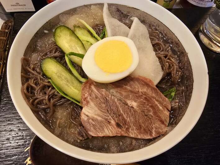 「今朝は あんなに 食べたのですが!」というコメントとともに投稿されたのは、六本木にある焼き肉店の名物“葛冷麺”の写真。みぞれ状に凍ったスープと、葛で作られた黒い麺が特徴で、トッピングにはキュウリや大根、チャーシュー、ゆで卵が彩りよく盛られています。