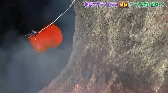 と、突然、男性がダイビング!これは、火口に向かって落下する「火山バンジー」なのだそう。
