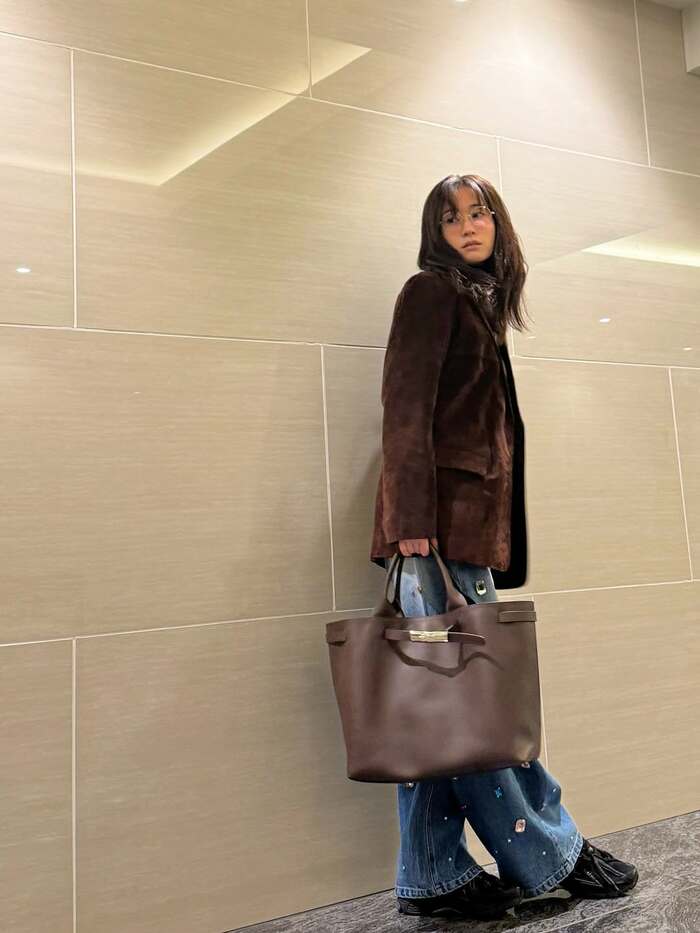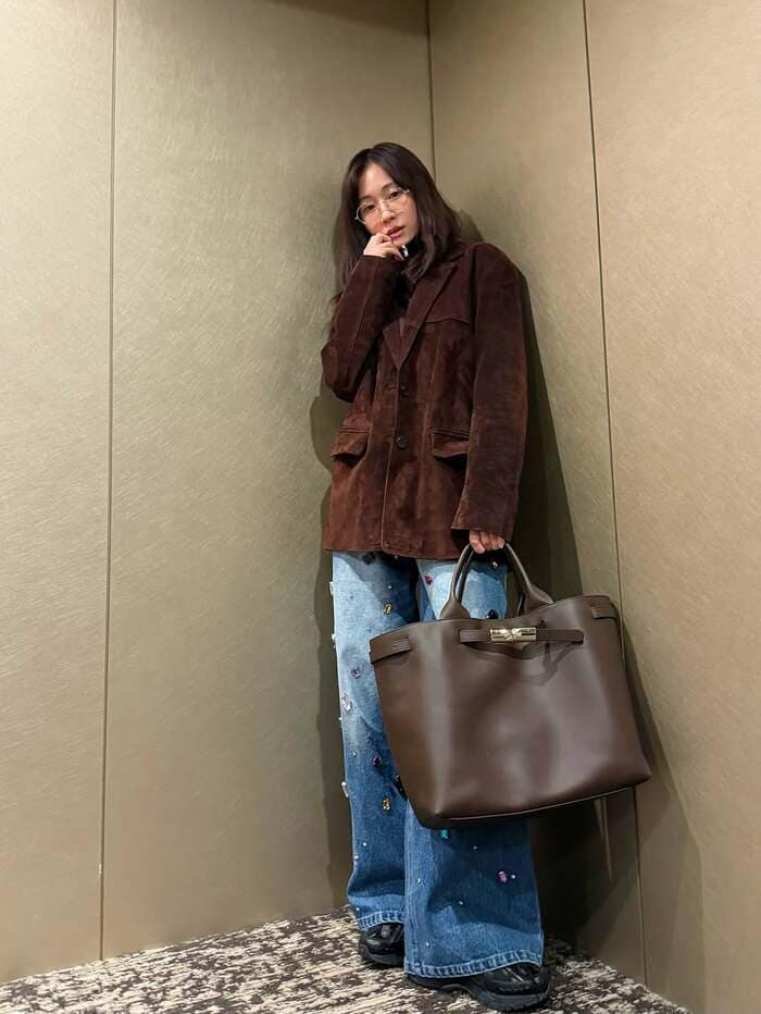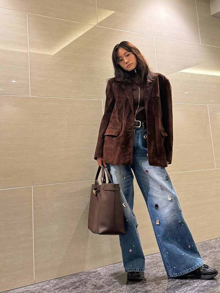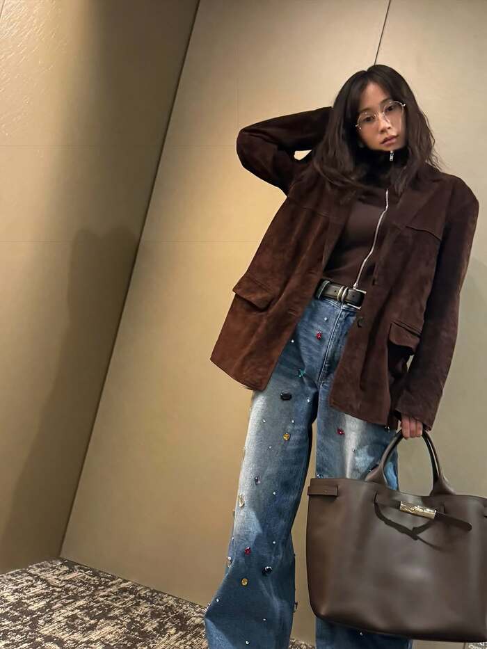 今回の投稿で「#私服」とつづり、大きなビジューがちりばめられたデニムに、ブラウンのジャケットを合わせ、ブラウンのバッグを持ったスタイルを披露した前田さん。足を肩幅ほどに開いてきゅっと腰を入れ、少し首をかしげてクールなまなざしでカメラを見つめています。