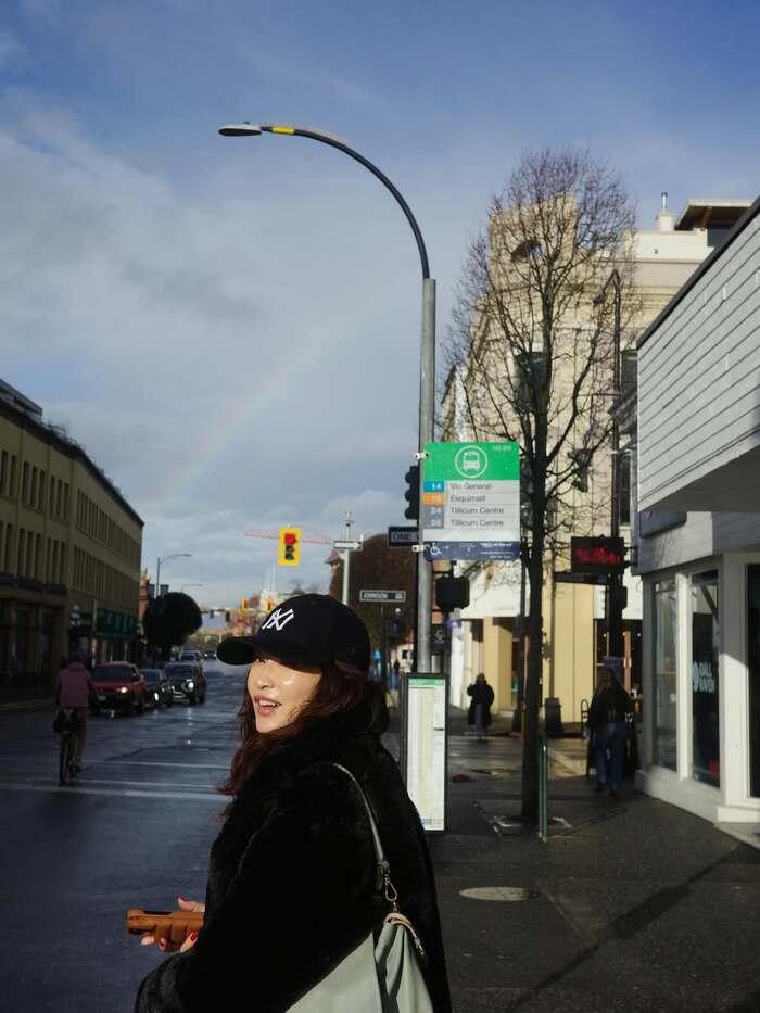 他の写真には、カナダの街中で撮影した長谷川さんのショットも。雨が降った後なのか道路は濡れていて、うっすら雲がかかった空には美しい虹が架かっています。