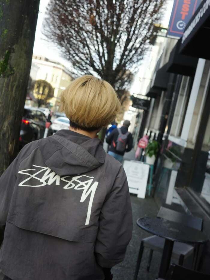 さらに、グレーのアウターに身を包み、金髪姿の息子がカナダの街を歩くショットも披露。