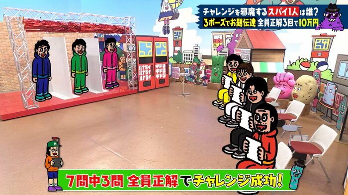 お題の特徴やイメージを、3人が打ち合わせなし&お互い見えない状態で、ポーズで同時に表現。そのポーズから解答役4人が予想し、正解できれば1ポイント獲得となります。