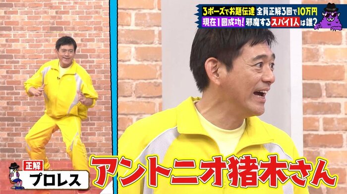 ノブさんと山内さんが表現した「ラリアット」が、かぶってしまったものの、華丸さんの「アントニオ猪木さん」を表現したポーズのおかげで、4人の解答は「プロレス」で全員一致の正解となりました。