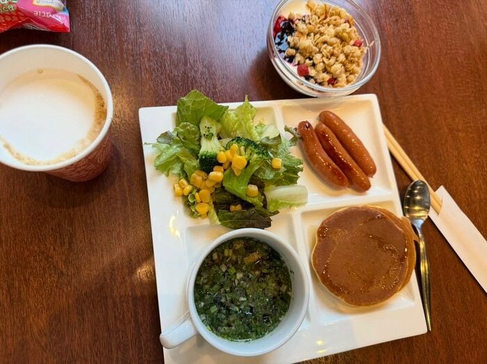 テーブルには、パンケーキとウインナー3本の他、スープ、レタスやコーンやブロッコリーのサラダ、シリアルやベリーが盛り付けられたヨーグルトが並んでいます。