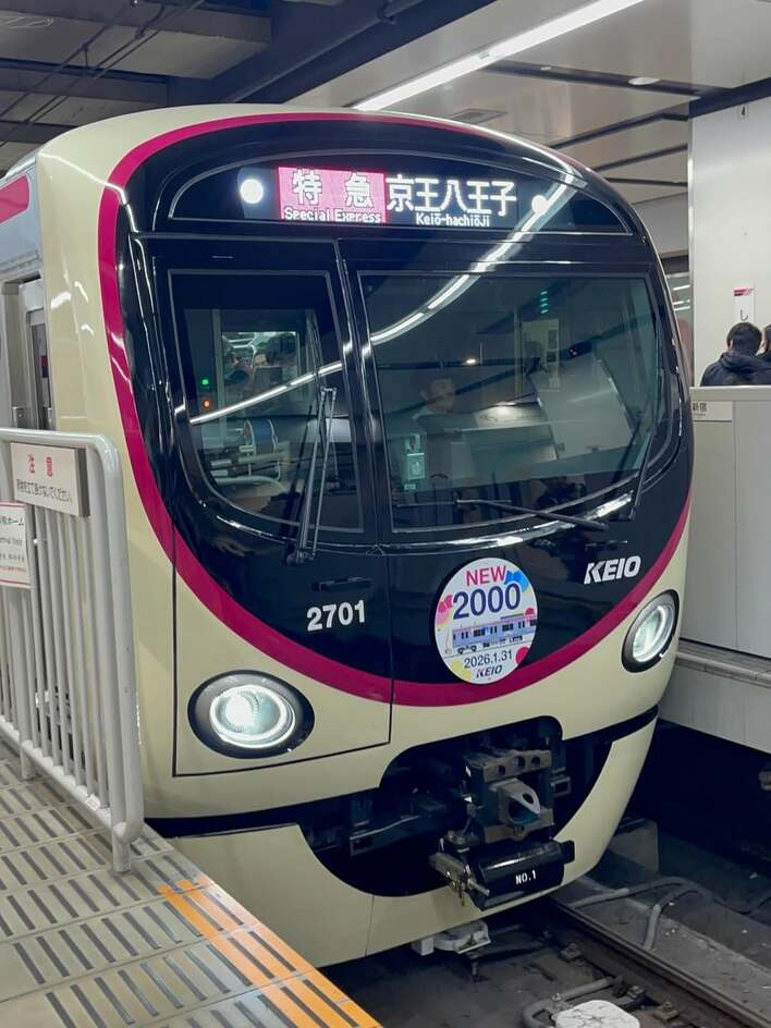 上部には「特急 京王八王子」と行き先が表示されていて、下部には「NEW 2000 2026.1.31」と記念の日付や電車のイラストが描かれたプレートのようなものが。運転席の後ろにある小さな窓からは、先頭の景色をカメラにおさめようと、スマートフォンをかまえる乗客の姿がちらりと顔をのぞかせています。