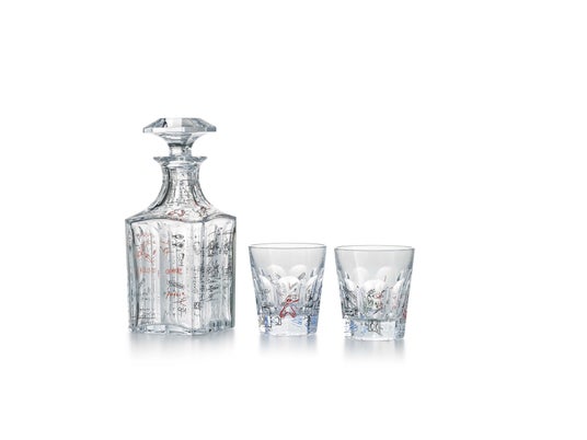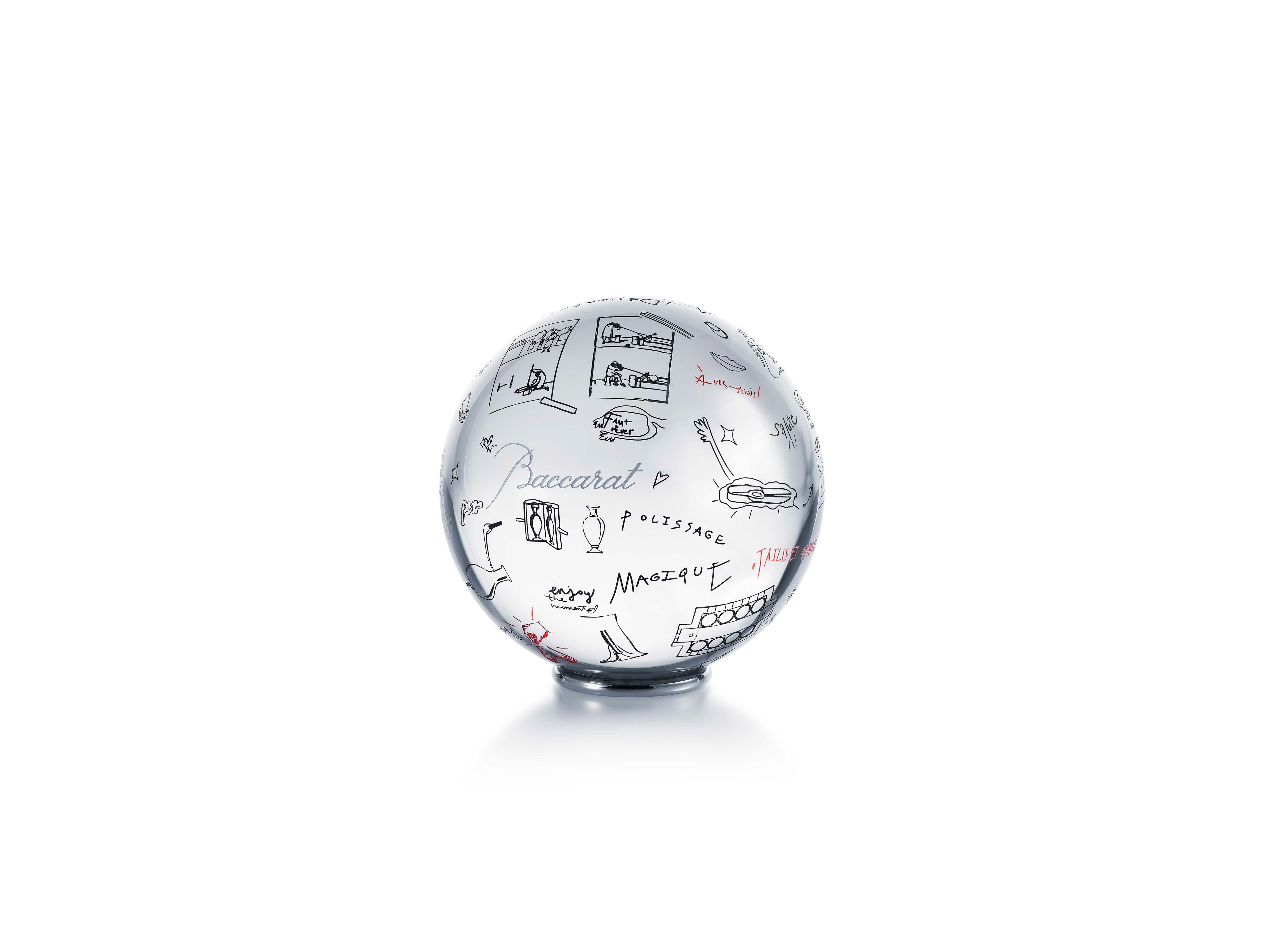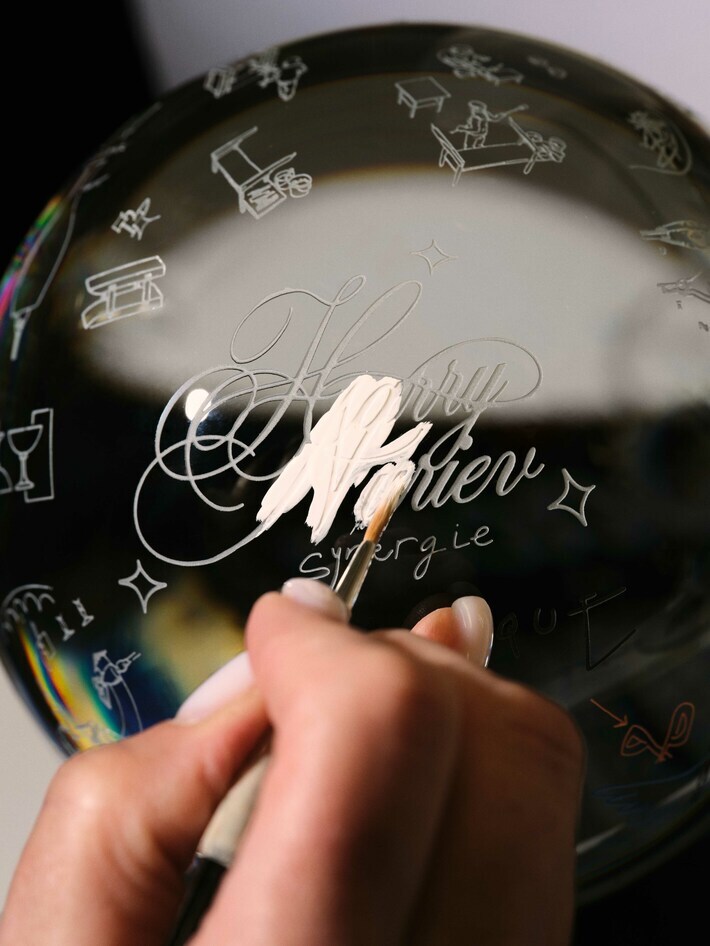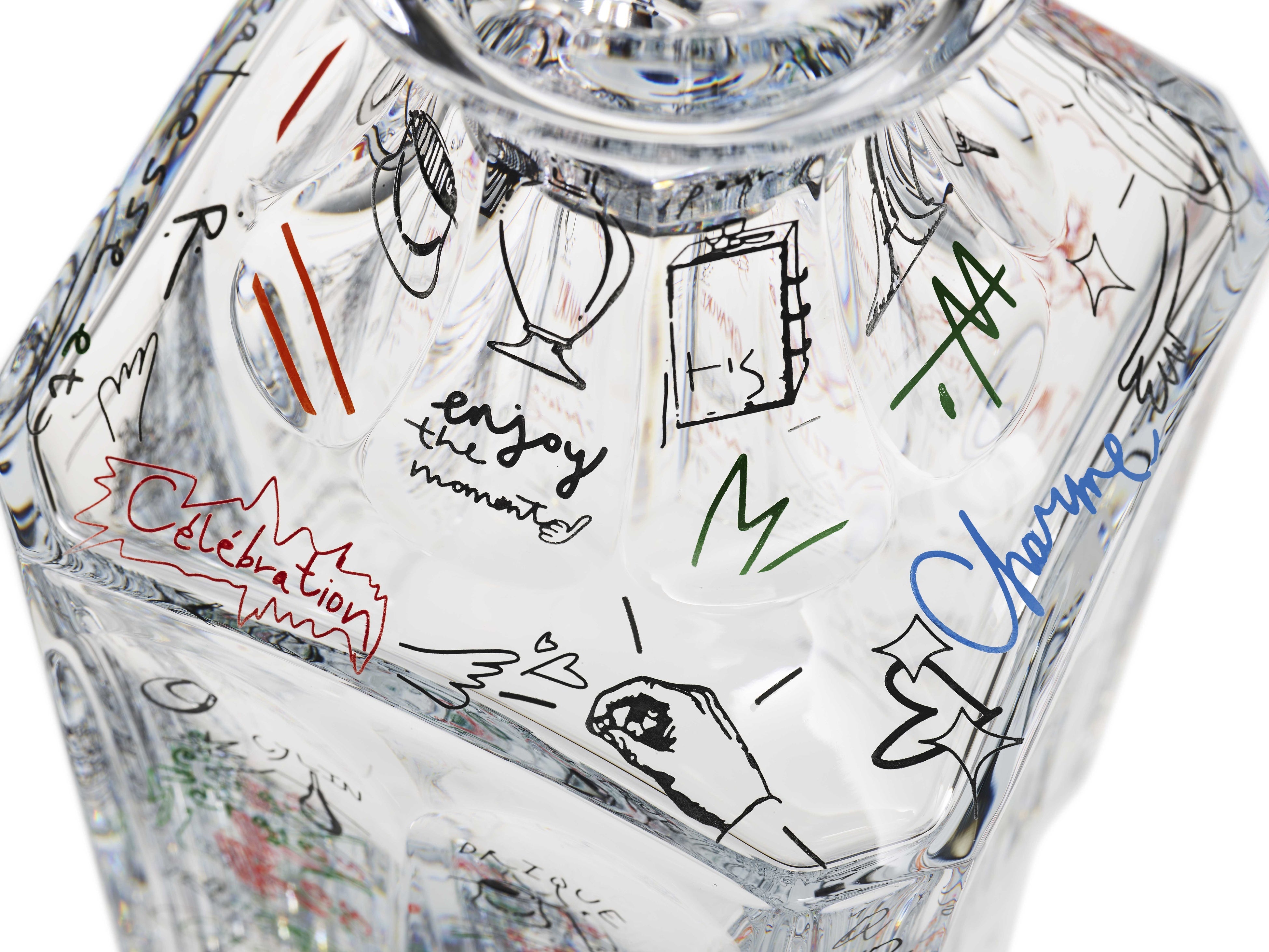 マニュファクチュールの金彩工房では、熟練の職人たちが彼のビジョンに命を吹き込みました。彼がメゾンからインスピレーションを受けた、「賞賛」「今この瞬間を楽しむ」「祝祭」「魅力」といった言葉や、バカラの世界観を象徴するモチーフやジェスチャーを、サンドブラストと手彩色のエナメルでクリスタルに刻み込んでいます。