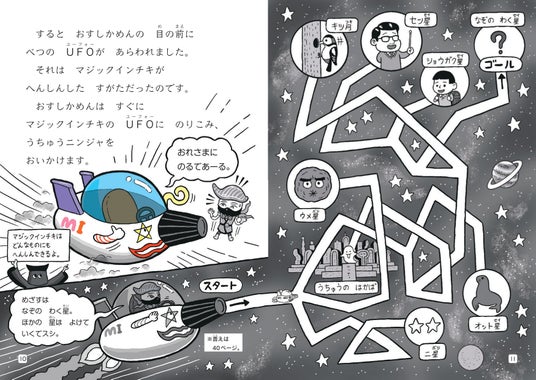 子どもが大好きな迷路のページがお話の中に入っているから、楽しく読み進められます。なぞのキャラ「くノ一」が仕かけた分身の術を見破る「間違い探しページ」は必見です。