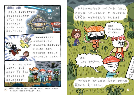 最新作では、ラーメンや冷蔵庫がモチーフの個性的なうちゅうニンジャたちを倒した正義のヒーロー・おすしかめんが、新たな敵に立ち向かいます。傷ついた仲間たちの代わりに、「おすしかめん2ごう」ことマジックインチキも登場。しかし、うちゅうニンジャや、なぞの「くノ一」たちがカラクリ城の前で、さまざまなワナを仕掛けてきます。一癖も二癖もあるトラップを、ふたりのおすしかめんがどう乗り越えていくのか、ご注目ください。前回までのあらすじが丁寧に入っているので、このお話から読んでも楽しめる作品です。