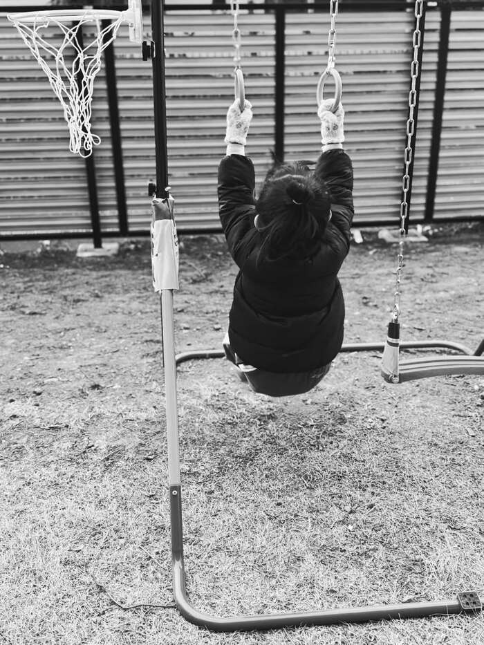 両足を持ち上げて、つり輪にぶら下がるショットも!遊具を一人占めして遊べることから、自分だけの特別な公園ですね。