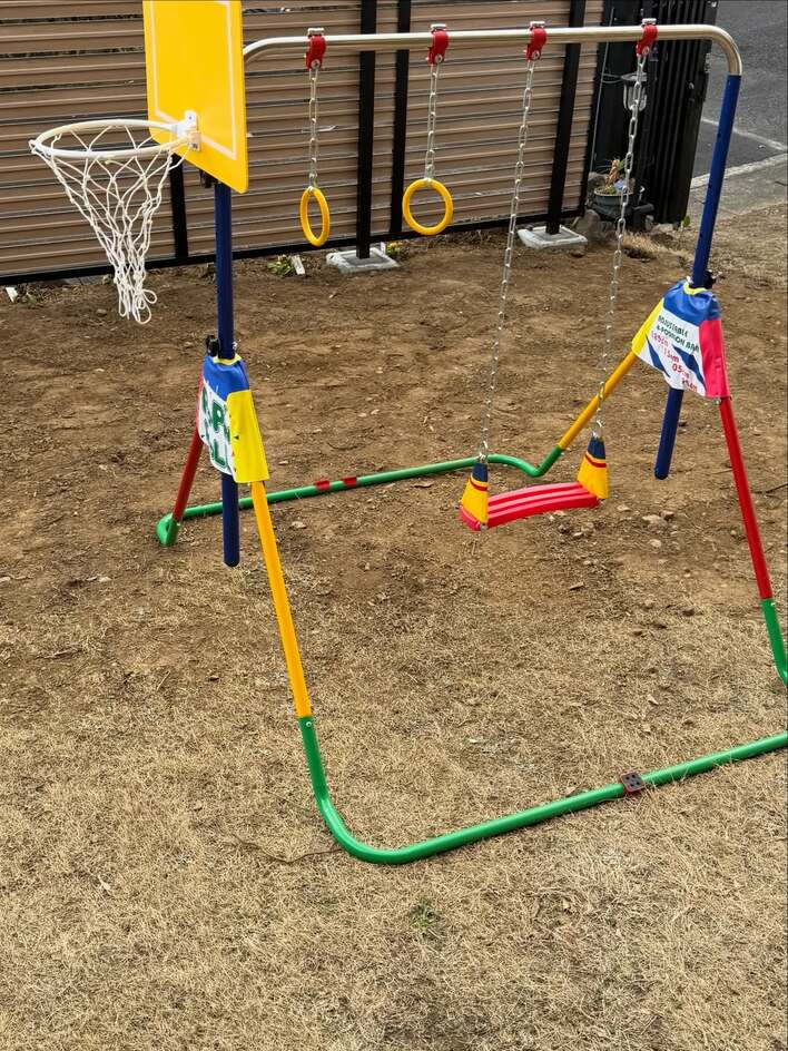 写真には、去年12月にテレビ番組でプレゼントしてもらったと報告していた、カラフルなブランコが広々としたお庭に設置されています。ブランコだけでなく、つり輪やミニサイズのバスケットゴールも付いていて、楽しく運動ができそうです。