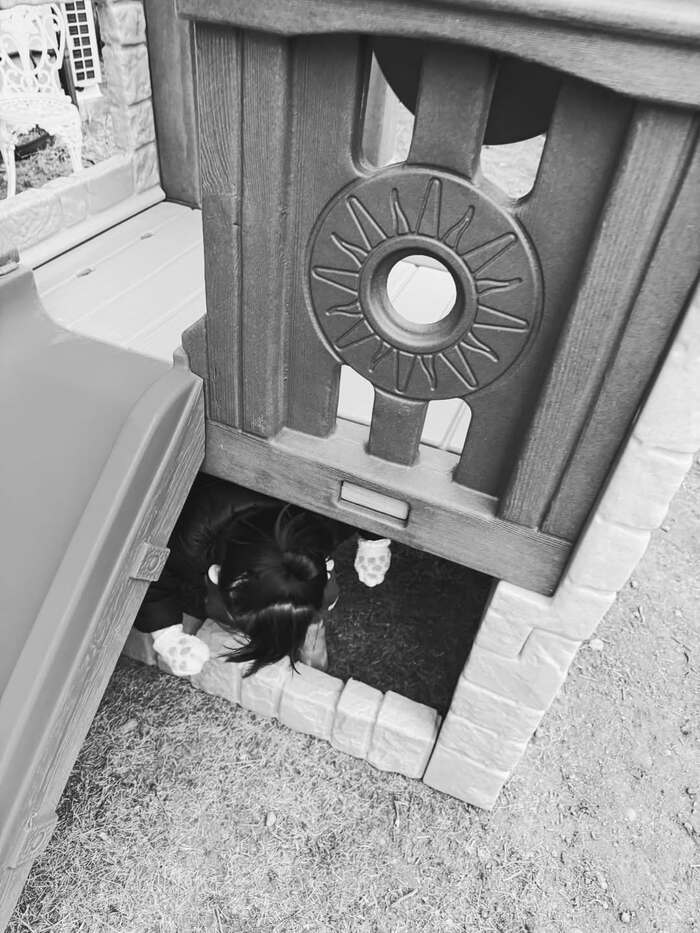 写真には、両手に手袋をはめた“ぷくぷくちゃん”が、すべり台の底のスペースに入る様子が!
