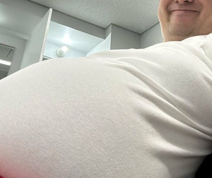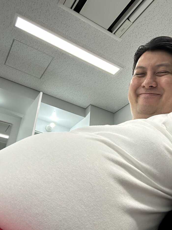 そこには、今にもはち切れそうなパンパンのおなかをアピールしながら、満面の笑みでカメラを見つめるジャンボたかおさんの姿が。