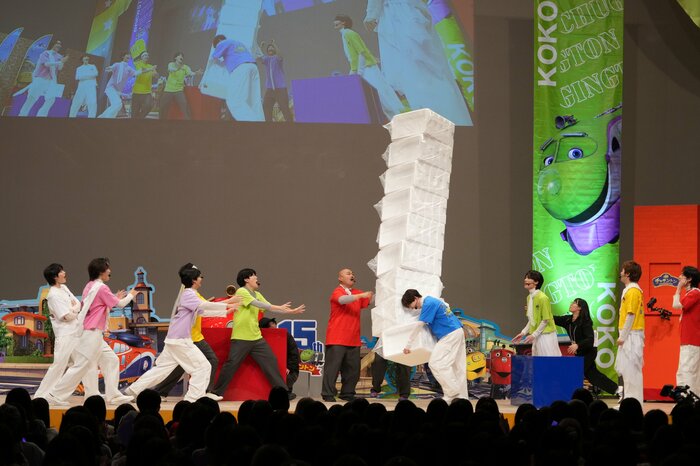 最後は、「ぐらぐら!バランスリレー」。1人ずつ大きな発砲スチロールをタワー状に積み上げながら順番に運び、バランス感覚を試すこの企画。時間の都合上、1回のみのチャレンジということもあり、メンバーには緊張が走り、観客も固唾をのんで挑戦を見守ります。