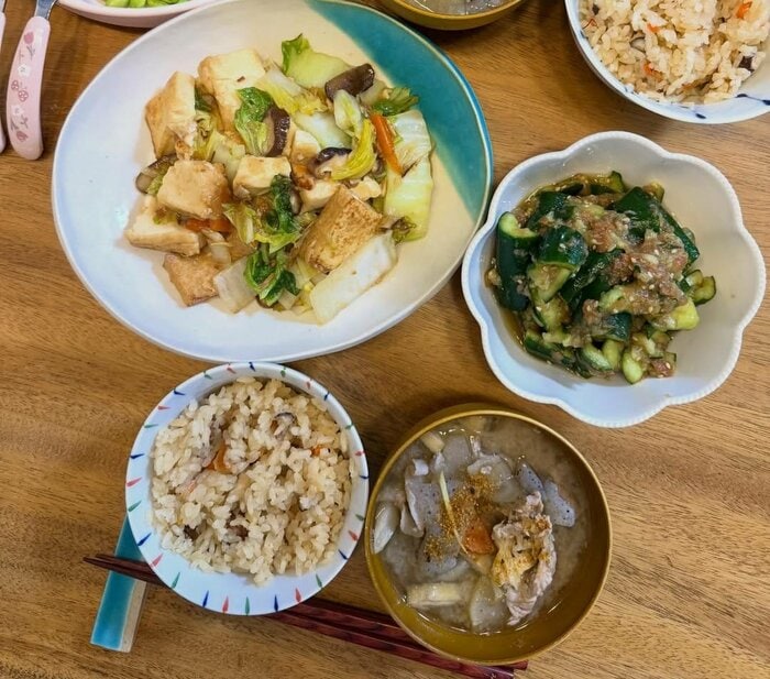 大皿にあるのは、くたくたに煮込まれた白菜と厚揚げ豆腐の炒め物なんだとか。シイタケやにんじんも入っていて、野菜をたくさん食べることができます。花の形のお皿にはきゅうりの梅和えが盛り付けられていて、お口がさっぱりしそうです。